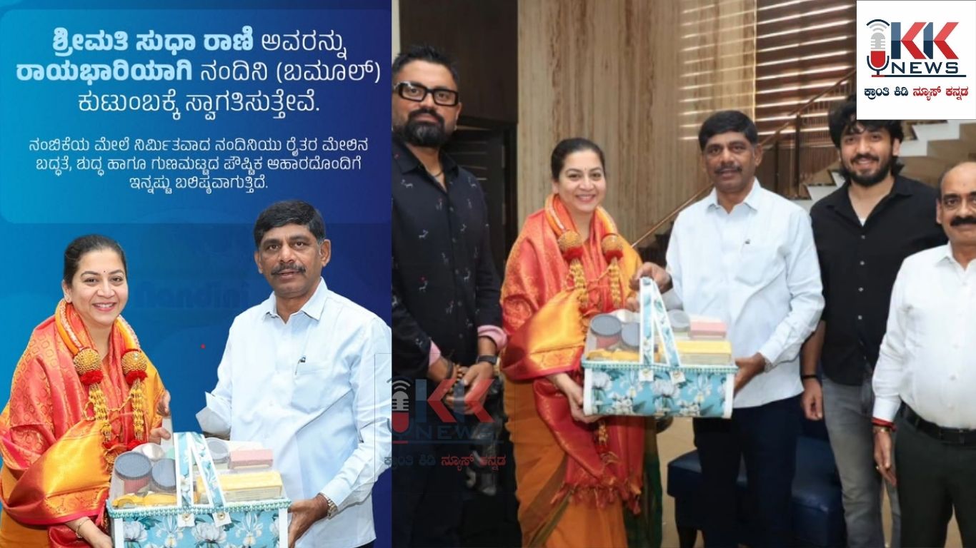 ಕರ್ನಾಟಕ ಹಾಲು ಉತ್ಪಾದಕರ ಒಕ್ಕೂಟದ ಪ್ರಮುಖ ಭಾಗವಾದ, ಬೆಂಗಳೂರು ಹಾಲು ಒಕ್ಕೂಟ ನಟಿ ಸುಧಾರಾಣಿ ಅವರನ್ನು ನಂದಿನಿ ಉತ್ಪನ್ನಗಳ ನೂತನ ಪ್ರಚಾರದ ರಾಯಭಾರಿಯನ್ನಾಗಿ ನೇಮಿಸಲಾದ ಬಗ್ಗೆ ಅಧಿಕೃತವಾಗಿ ಘೋಷಿಸಿದೆ. ನಂದಿನಿ ಉತ್ಪನ್ನಗಳಿಗೆ ಪ್ರಚಾರ ರಾಯಭಾರಿಯಾಗಿ ಶ್ರೀಮತಿ ಸುಧಾ ರಾಣಿ ಅವರು ಆಯ್ಕೆಯಾಗಿದ್ದು, ಬಮೂಲ್ ಕುಟುಂಬಕ್ಕೆ ಅವರನ್ನು ಪ್ರೀತಿಯಿಂದ ಸ್ವಾಗತಿಸುತ್ತೇವೆ ಎಂದು ಡಿಕೆ ಸುರೇಶ್ ಅವರು ಬರೆದುಕೊಂಡಿದ್ದಾರೆ.