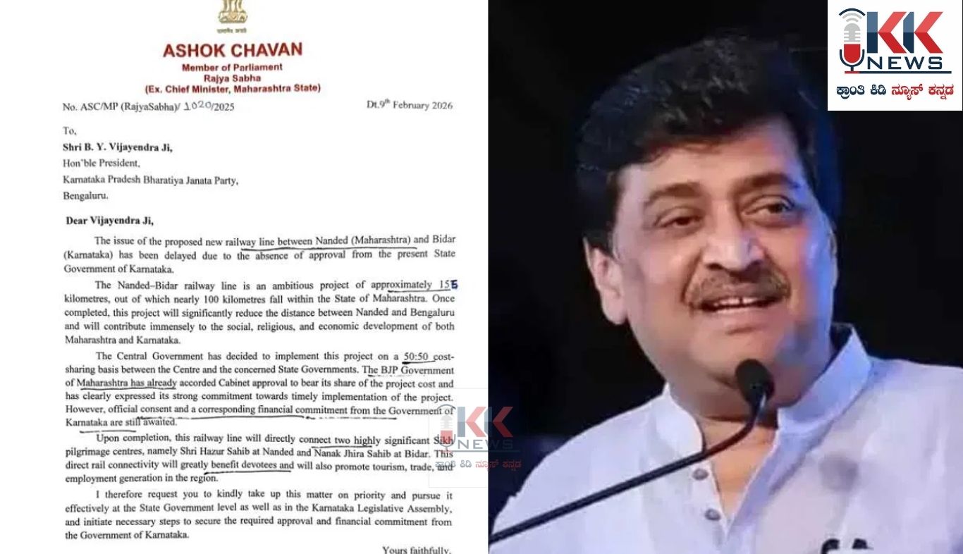 ಬೆಂಗಳೂರು : ಮಹಾರಾಷ್ಟ್ರದ ನಾಂದೇಡ್ ಮತ್ತು ಕರ್ನಾಟಕದ ಬೀದರ ನಡುವೆ ಹೊಸ ರೈಲು ಮಾರ್ಗ ಯೋಜನೆಯು ವಿಳಂಬವಾಗುತ್ತಿರುವ ಹಿನ್ನೆಲೆಯಲ್ಲಿ ಬಿಜೆಪಿ ರಾಜ್ಯಾಧ್ಯಕ್ಷರಾದ ಬಿ.ವೈ. ವಿಜಯೇಂದ್ರ ಅವರಿಗೆ ಉತ್ತರಿಸಿ ಪತ್ರ ಬರೆದಿರುವ ಅಶೋಕ್ ಚವಾಣ್, ವಿಳಂಬಕ್ಕೆ ಕಾರಣವೇನೆಂದು ವಿವರಿಸಿದ್ದಾರೆ.